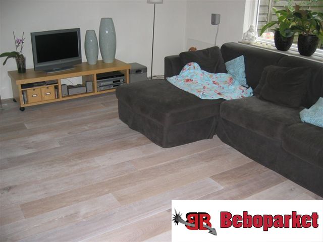 55m2 Eiken lamel parket 19cm breed 15mm dik kant en klaar gewhitewashed.